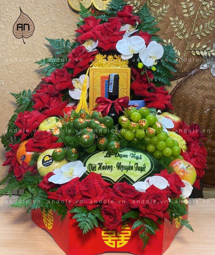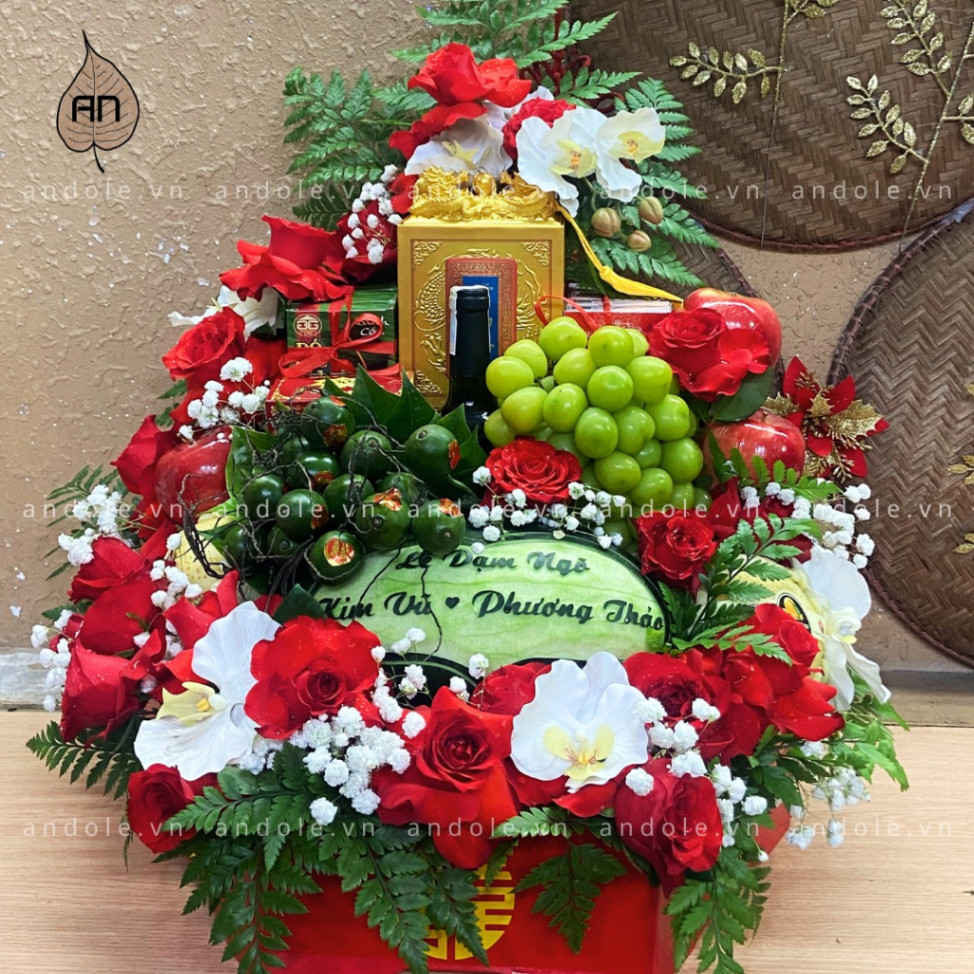 - Hoa quả tươi cao cấp: Táo đỏ, táo xanh, nho xanh và dưa hấu được trang trí đẹp mắt với dòng chữ nghệ thuật "Lễ Dạm Ngõ - Trăm năm hồng thắm."