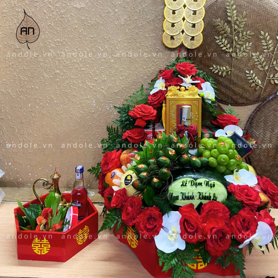 Tráp Lễ Dạm Ngõ được chuẩn bị chu đáo với hoa quả tươi, bánh kẹo cao cấp, rượu trà và hoa trang trí đẹp mắt, mang đến ý nghĩa sâu sắc cho nghi lễ.
